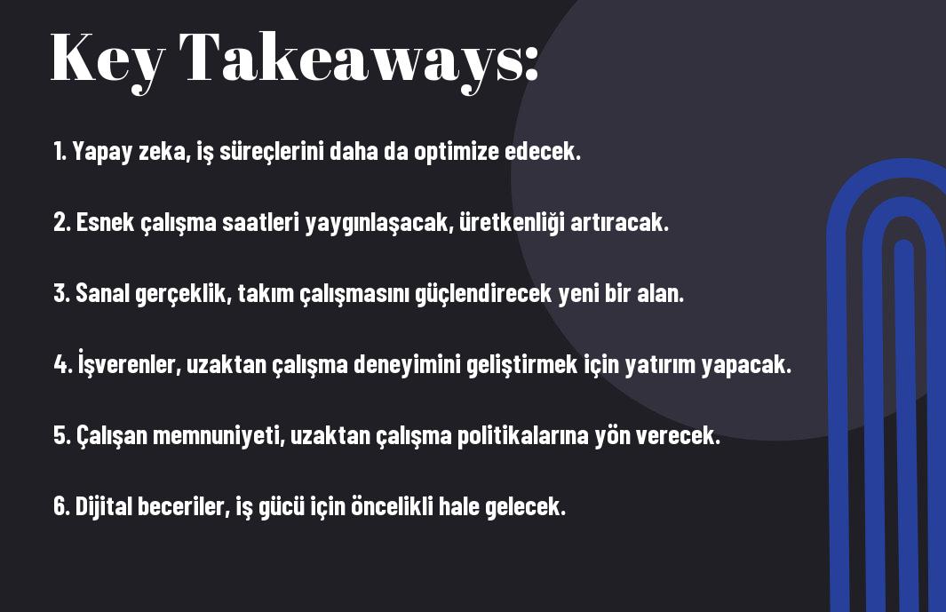 • Uzaktan çalışma teknolojileri, özellikle Sanal Gerçeklik (VR) ve Yapay Zeka (AI) ile daha da geliştirilerek, ekiplerin işbirliğini artıracak.