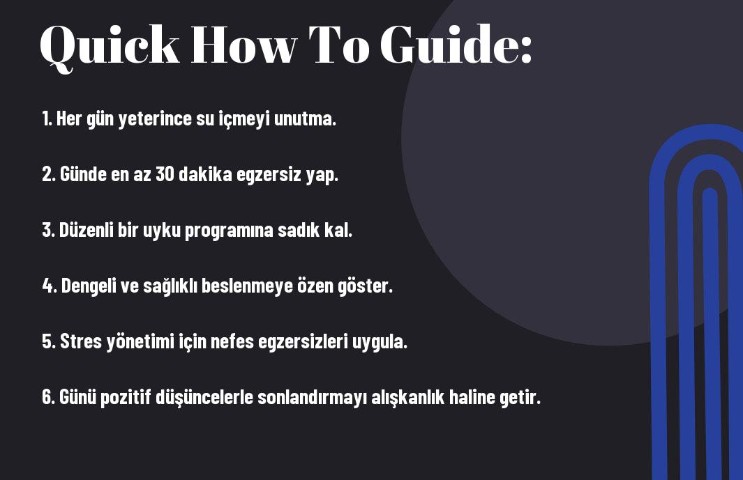 Sağlıklı bir yaşam sürmek için her gün küçük ama etkili alışkanlıklar edinmelisiniz. Günde en az iki litre su içmek, düzenli egzersiz yapmak ve uyku düzeninize dikkat etmek, hem fiziksel hem de zihinsel sağlığınızı olumlu yönde etkileyecektir. Bu alışkanlıkları günlük rutininize entegre ederek, yaşam kalitenizi artırabilir ve enerjik bir yaşam sürdürebilirsiniz. Unutmayın, sağlıklı bir yaşam tarzı seçimi, sizin elinizde!